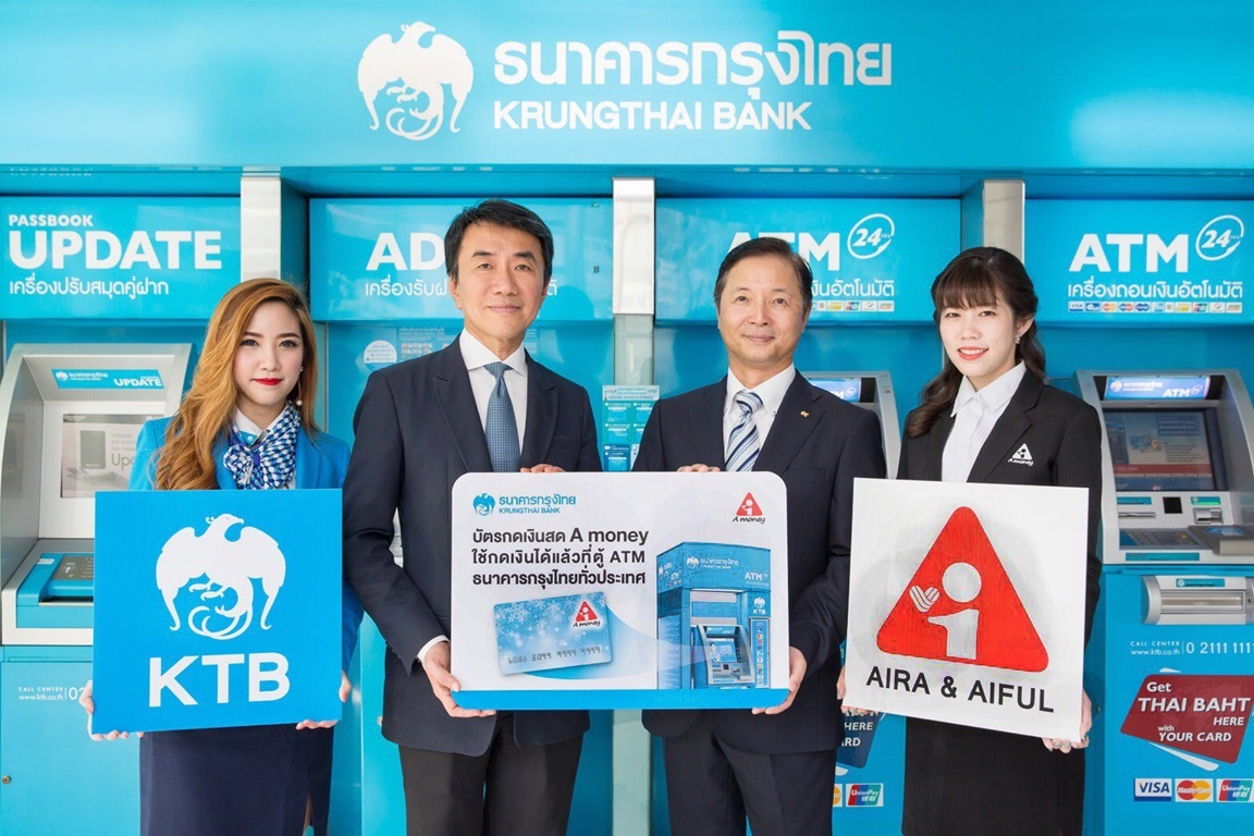 นายคัทสุฮิโกะ มาโดโนะ (ที่ 2 จากขวา) ประธานเจ้าหน้าที่บริหาร บริษัท ไอร่า แอนด์ ไอฟุล จำกัด (มหาชน) พร้อมด้วย นายกฤษณ์ เนื่องสิกขาเพียร (ที่ 2 จากซ้าย) ผู้ช่วยกรรมการผู้จัดการใหญ่ ผู้บริหารกลุ่ม สายงานบริหารจัดการทางการเงินเพื่อธุรกิจ ธนาคารกรุงไทย จำกัด (มหาชน) ร่วมบันทึกภาพความร่วมมือในการให้บริการเบิกถอนเงินจากบัตรกดเงินสด "A money" ผ่านตู้เอทีเอ็มของธนาคารกรุงไทย ที่มีจำนวนกว่า 12,000 เครื่องทั่วประเทศ โดยมีค่าธรรมเนียมในการใช้บริการกดเงิน 13 บาทต่อรายการ ซึ่งพร้อมให้บริการตั้งแต่วันนี้ เพื่อเป็นการเพิ่มช่องทางการในการให้บริการ และเพื่อเพิ่มความสะดวกให้กับผู้ที่ถือบัตรกดเงินสด A money มากยิ่งขึ้น ณ ธนาคารกรุงไทย สำนักงานใหญ่ กรุงเทพฯ เมื่อเร็ว ๆ นี้