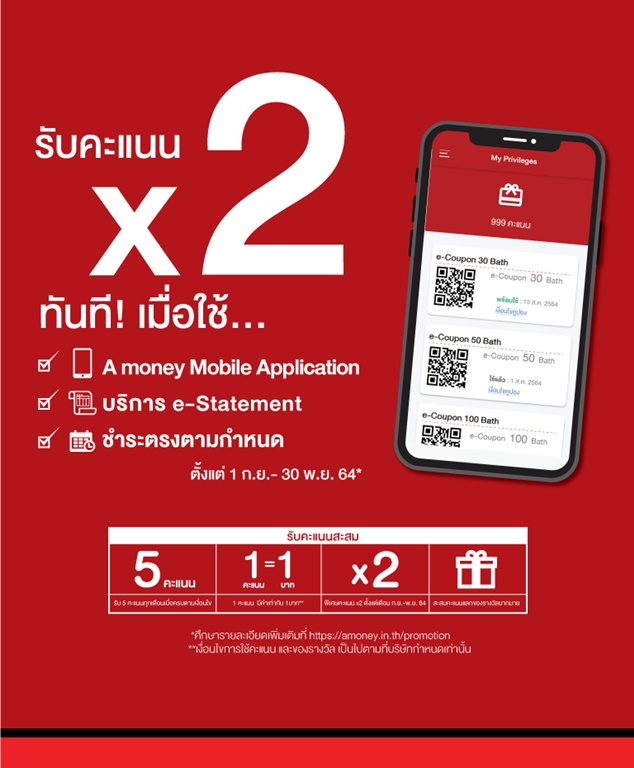 รับคะแนนสะสม x2 ทันที เมื่อใช้ แอป A money, บริการ e-Statement, ชำระตรงตามกำหนด