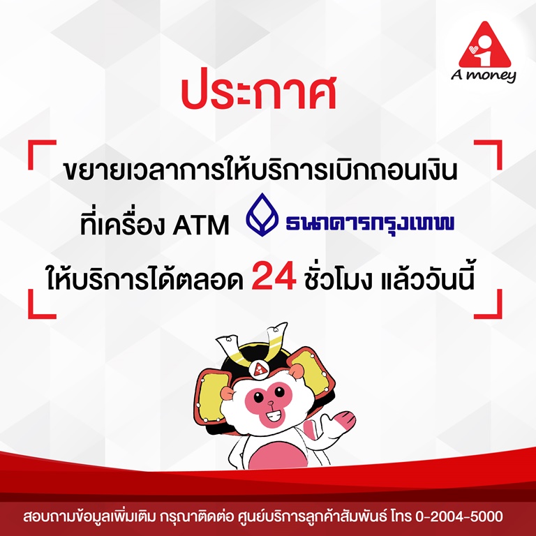 บัตรกดเงินสด A money สามารถเบิกถอนเงินผ่านเครื่อง ATM ธนาคารกรุงเทพ ได้ตลอด 24 ชั่วโมง