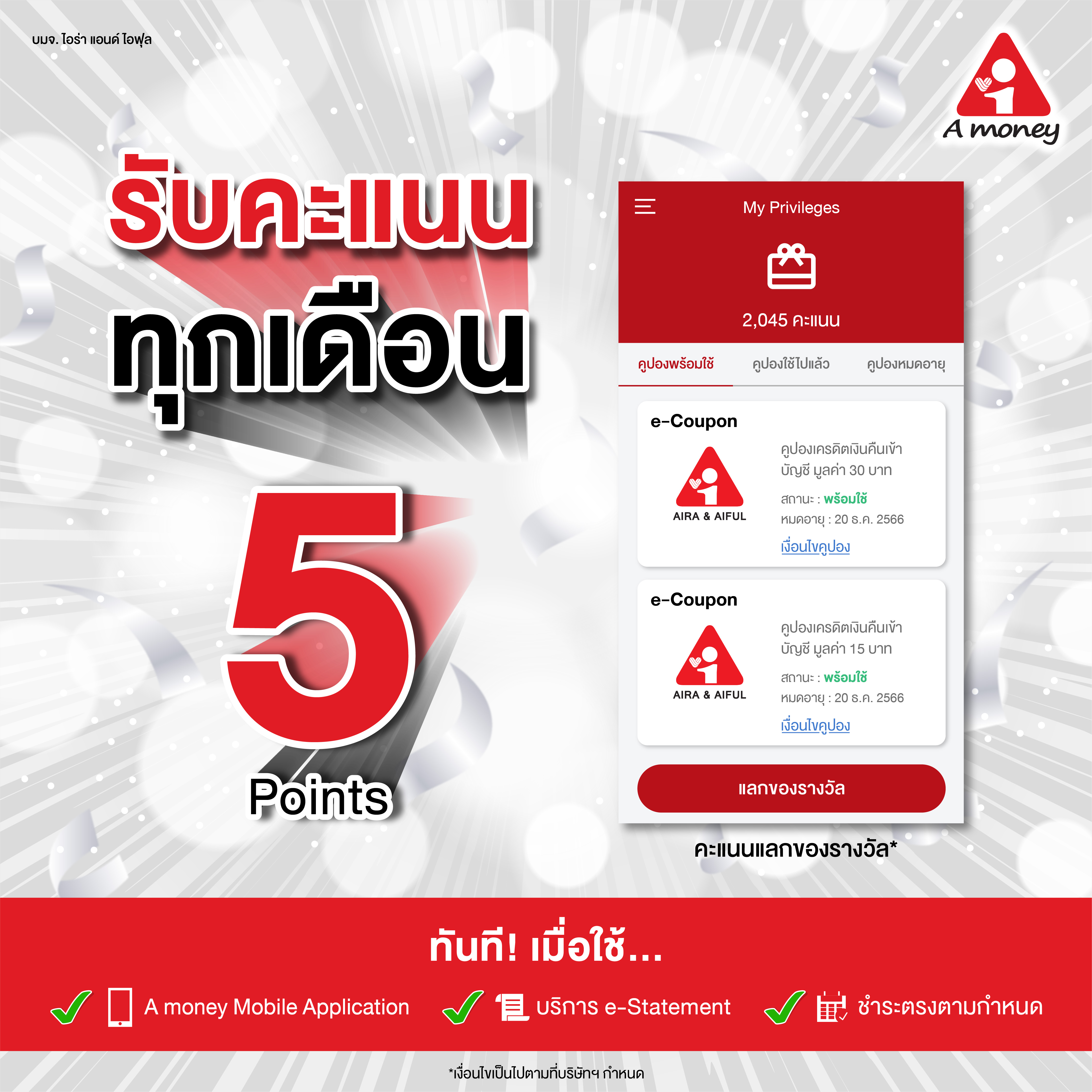 รับฟรี 5 พ้อยท์ ทันที! เมื่อใช้ แอปพลิเคชัน, e-Statement, ชำระตรงตามกำหนด