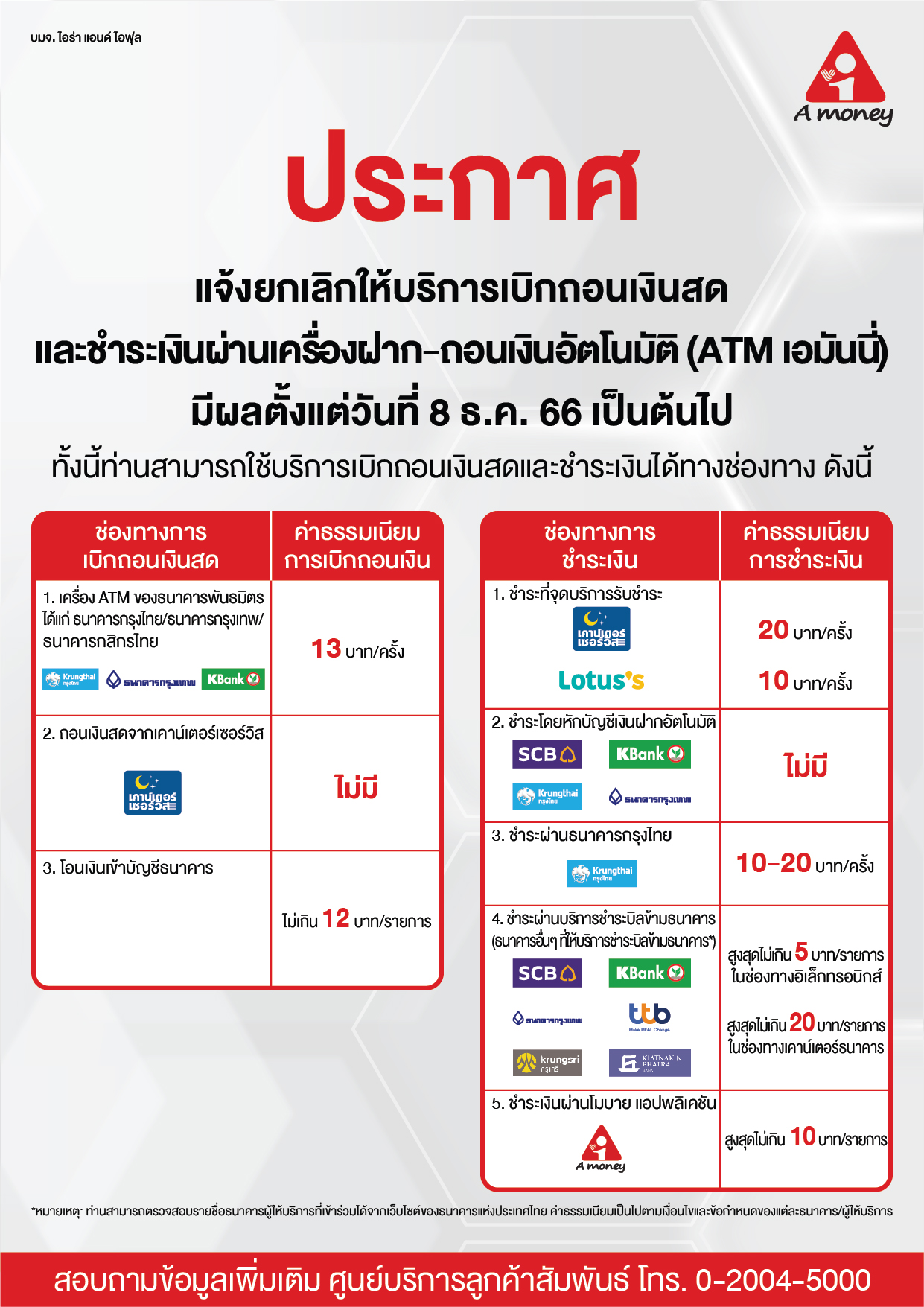 แจ้งยกเลิกให้บริการ ATM A money ตั้งแต่วันที่ 8 ธันวาคม 2566 เป็นต้นไป