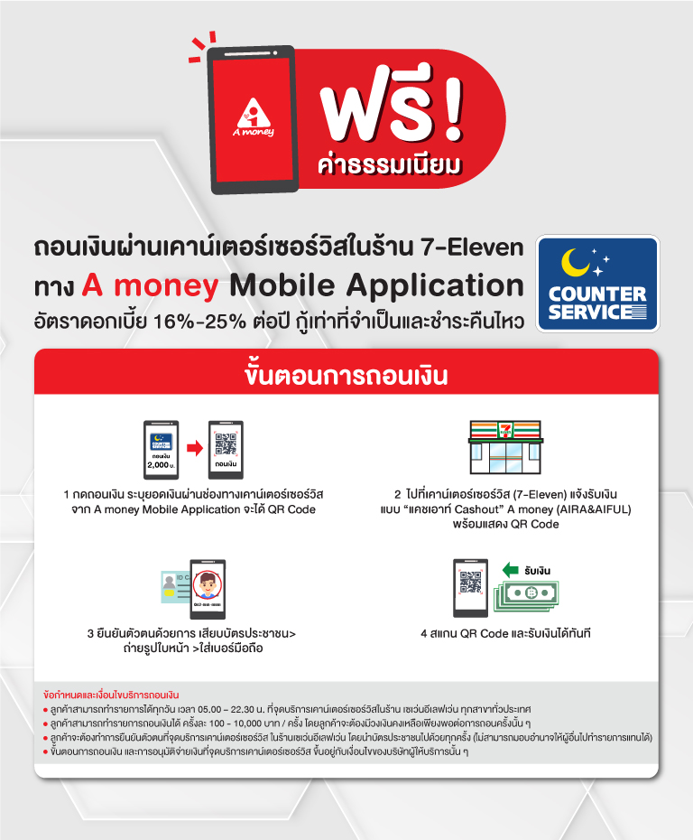 ฟรีค่าธรรมเนียม ถอนเงินจากแอป A money แล้วเลือกรับเงินที่เคาน์เตอร์เซอร์วิสใน 7-Eleven