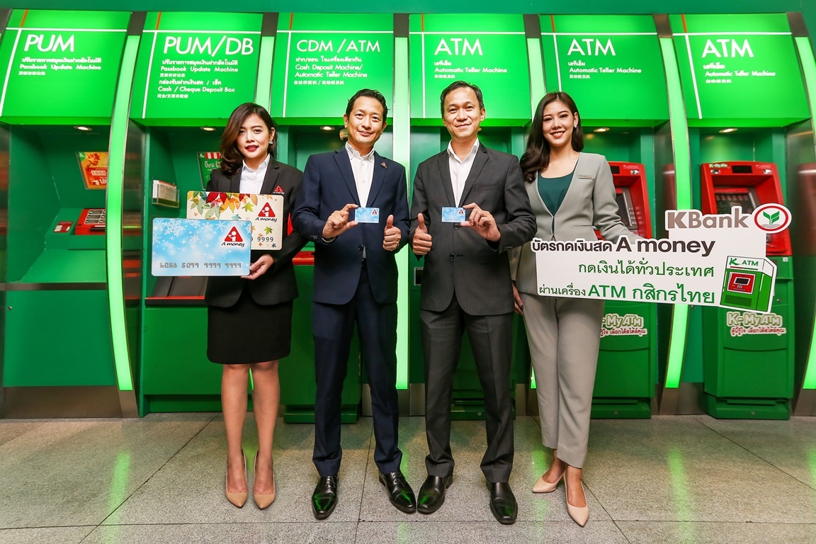 บัตรกดเงินสด A money เตรียมกดเงินได้ที่ K-ATM ทั่วประเทศ นายสุรเดช เกียรติธนากร (ที่ 3 จากซ้าย) ผู้ช่วยกรรมการผู้จัดการ ธนาคารกสิกรไทย และนายยูจิ ฟุคาดะ (ที่ 2 จากซ้าย) ประธานเจ้าหน้าที่ฝ่ายขายและปฎิบัติการ บริษัท ไอร่า แอนด์ ไอฟุล จำกัด (มหาชน) ผู้ให้บริการบัตรกดเงินสด “A money” ร่วมเปิดให้บริการแก่ผู้ถือบัตรกดเงินสด A money สามารถเบิกถอนเงินสดจากเครื่องเอทีเอ็มกสิกรไทย (K-ATM) กว่า 9,000 เครื่องทั่วประเทศ ได้ตั้งแต่วันที่ 9 ก.พ. 2561 เป็นต้นไป เพื่ออำนวยความสะดวกและเพิ่มช่องทางถอนเงินให้ลูกค้าบัตรกดเงินสด A money ณ ธนาคารกสิกรไทย สำนักงานใหญ่ เมื่อเร็ว ๆ นี้