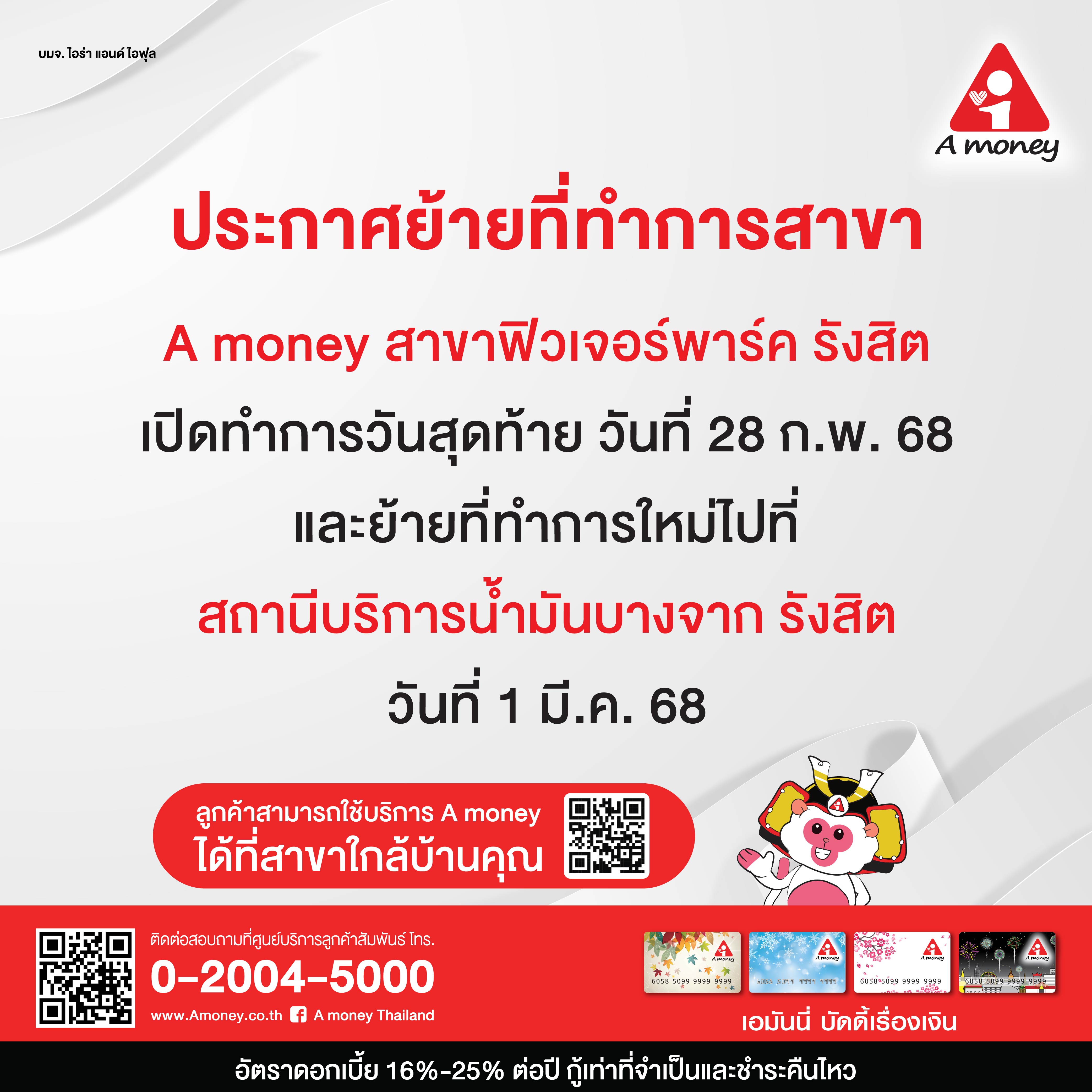 ประกาศย้ายที่ทำการสาขา A money สาขาฟิวเจอร์พาร์ค รังสิต ไปที่ สถานีบริการน้ำมันบางจาก รังสิต