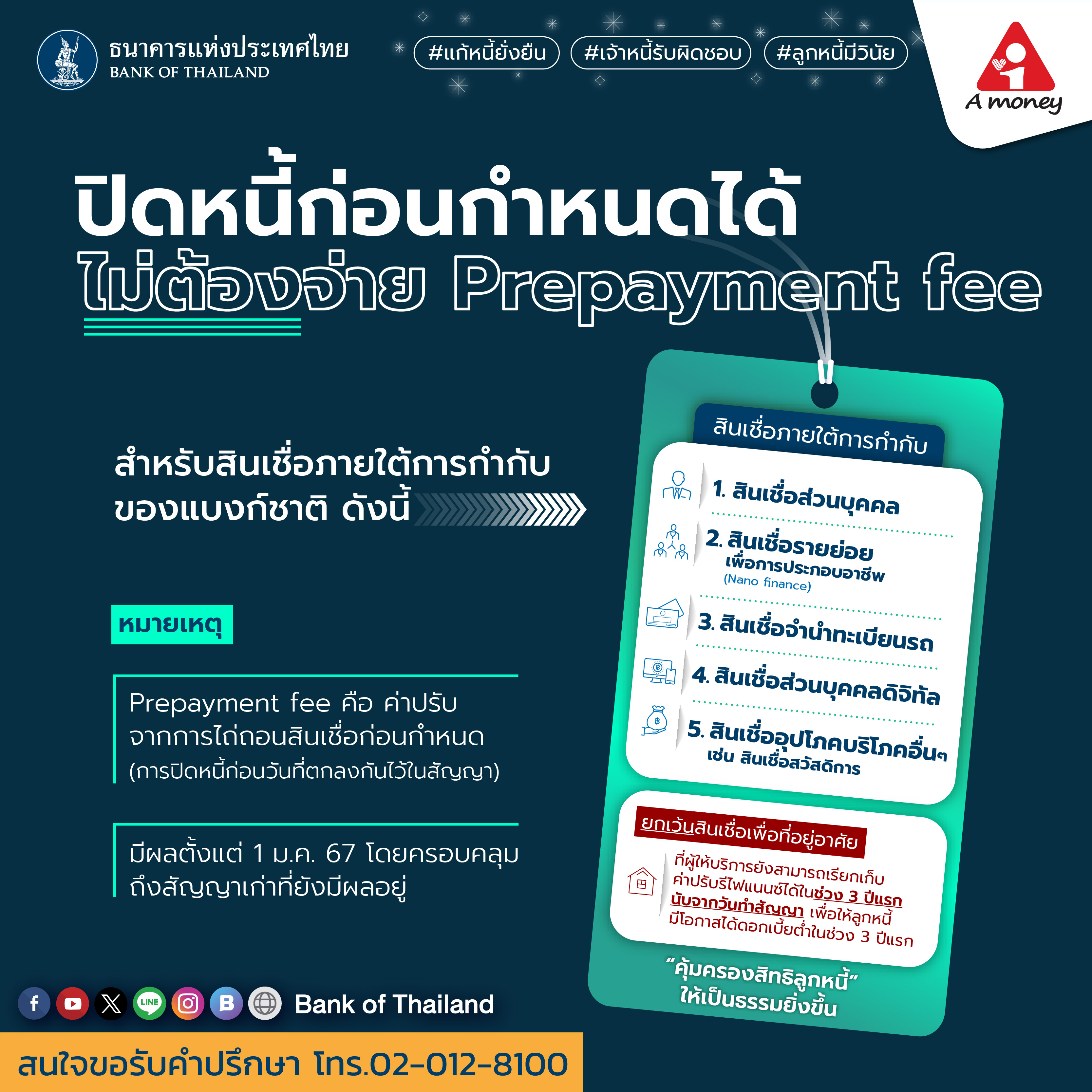 ธนาคารแห่งประเทศไทย ห้ามเจ้าหนี้เรียกเก็บ Prepayment fee ในสินเชื่อภายใต้กำกับของธนาคารแห่งประเทศไทย ดังนี้